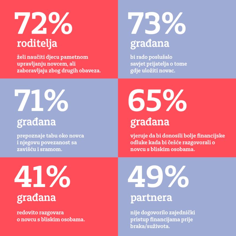 Podaci upućuju na postupne promjene u odnosu prema novcu, Sve više građana prepoznaje važnost razgovora o financijama, ali se tema i dalje izbjegava u svakodnevnoj komunikaciji, često i unutar obitelji i partnerskih odnosa.
