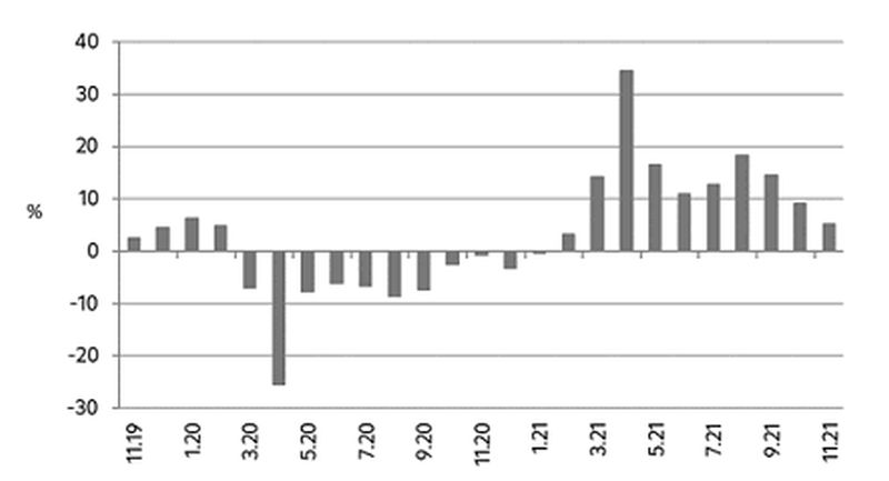 Nominalne promjene očekivano su zamjetno veće pa je prema izvornim indeksima nominalan promet veći za 12,8 posto u odnosu na studeni 2020. (12,2% prema kalendarski prilagođenim indeksima).