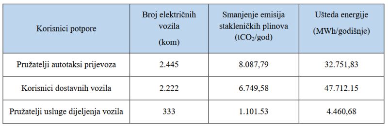 Procjenjuje se da bi se zahvaljujući ovom natječaju na hrvatskim cestama trebalo pojaviti više od 5000 novih električnih vozila. Planira se sufinanciranje 2445 taksi vozila, 2222 dostavna vozila te 333 vozila za dijeljeni prijevoz.