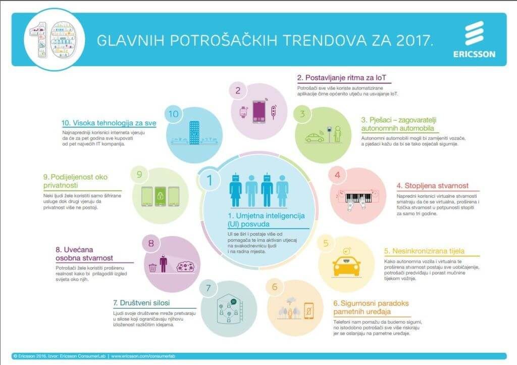 Ericssonov ConsumerLab predstavio je šesto izdanje svojeg godišnjeg izvješća o trendovima. U ovogodišnjem izvješću važna teme je umjetna inteligencija (UI) jer potrošači smatraju da ona ima sve važniju ulogu i u društvu i u poslu. Štoviše, 35 posto naprednih korisnika interneta je žele u ulozi savjetnika na poslu, a jedan od četiri ispitanika bi želio UI kao rukovoditelja.